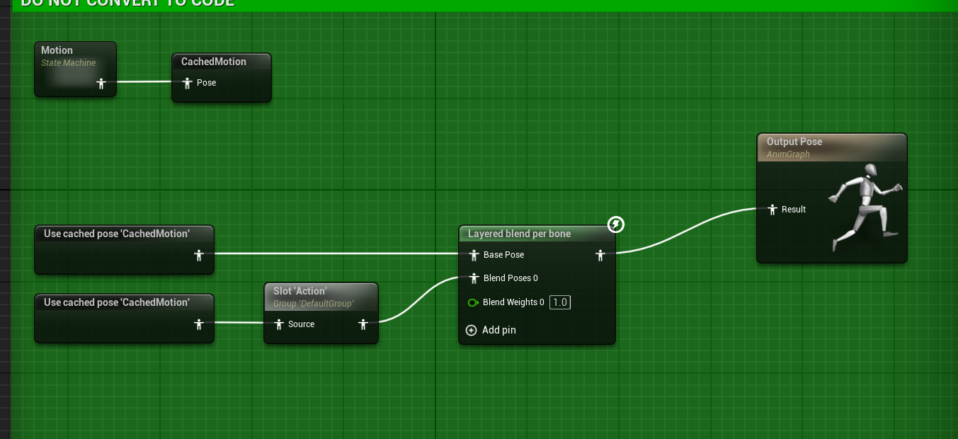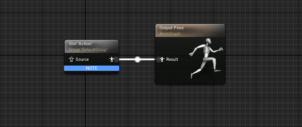 Then the final issue was keeping the door open. After it would play the open animation, it would just go back to the default way the model looked, which was closed. I tried stopping the method just before it ended hoping it would pause there but that just made the animation exit early and go back to closed too. I then came up with the idea to make a duplicate of the animation, and remove all the frames but the last few where it doesn't noticeably move and the door is open, and then have the final "idle" state just play that animation over and over, keeping it open even though the animation doesn't actually move it (only 3 frames long of standing still, I also significantly slowed it down and put it on loop). This is where I got stuck the longest as trying to play this animation would just visually do nothing, the door stayed closed and didn't move. I thought maybe something was wrong since the animation was so short so I tried just cutting the original one in half. I used the 2nd half but when it played it played just the first half of the animation. This was very interesting. I then tried playing the animation backwards, but then in the game once again it just started from the beginning. It wasn't playing the animations right, it was like it just wanted to keep the original version of it. I then thought back to the anim graph (shown in the problem), I don't fully understand what that stuff does but what I do know is what cache means, and I thought maybe that was causing the issue, the original animation was getting cached and it kept trying to use that. I removed that stuff and hooked the slot straight into the output, and just like that it worked (shown below)!